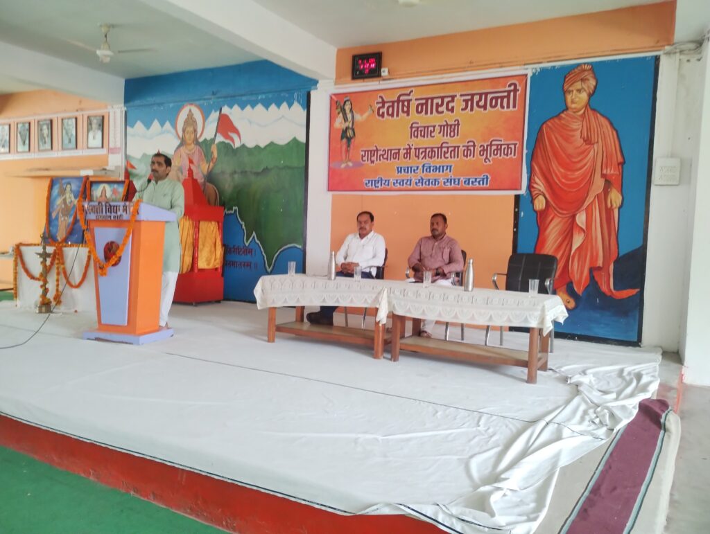 बस्ती (उ. प्र.)। पत्रकारिता देव लोक से शुरु होकर अनवरत किये जाने वाला कर्तव्य है। महर्षि नारद जी ने देव लोक में पत्रकारिता की शुरूआत की थी। चुनौतियां तब भी थीं, चुनौतियां अब भी हैं और सदैव रहेंगी भी। आवश्यकता है पत्रकारिता में कार्य करते तटस्थ और निर्भीक बने रहना। हमें अपने देश और समाज के हित में कार्य करते हुए नैतिक मूल्यों की स्थापना के लिए कार्य करते रहना होगा। पत्रकारिता में महर्षि नारद जी के व्यक्तित्व और कृतित्व का अनुसरण होना चाहिए।