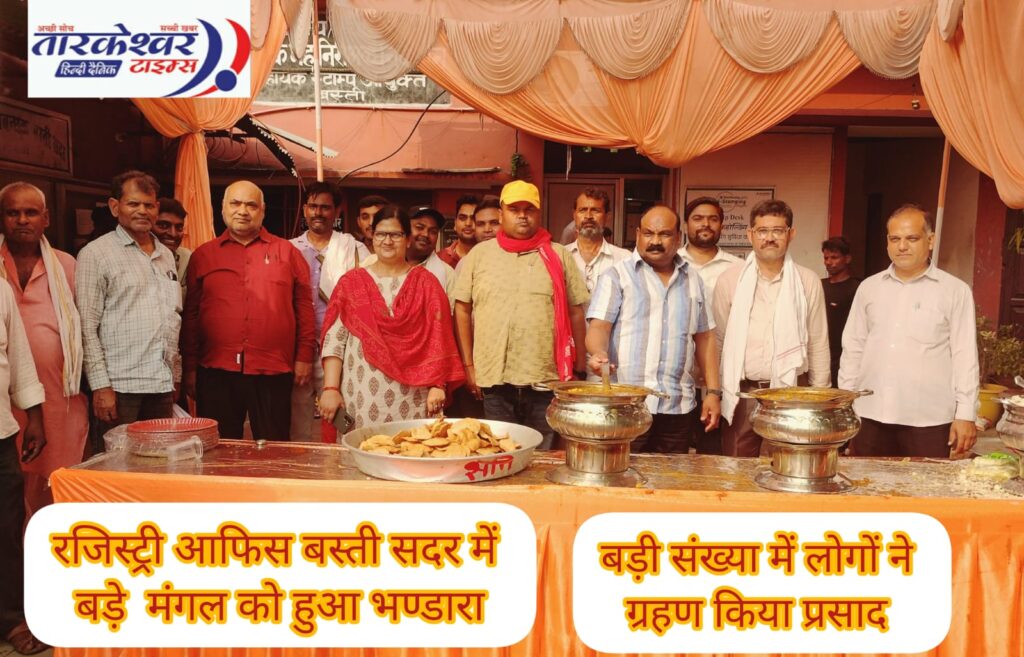बस्ती (उ. प्र.)। विक्रम संवत 2082 ज्येष्ठ मास के अंतिम मंगलवार को हर तरफ बड़े मंगल को लेकर पूजा, अर्चना, कीर्तन व भण्डारे की धूम रही। इस अवसर पर बस्ती शहर में भी अनेकों स्थानों पर भण्डारा का आयोजन किया गया। कुछ सरकारी कार्यालयों पर भी भण्डारे का विधिवत आयोजन करके प्रसाद का वितरण किया गया। इसमें बस्ती सदर के रजिस्ट्री आफिस में भी भण्डारा किया गया।