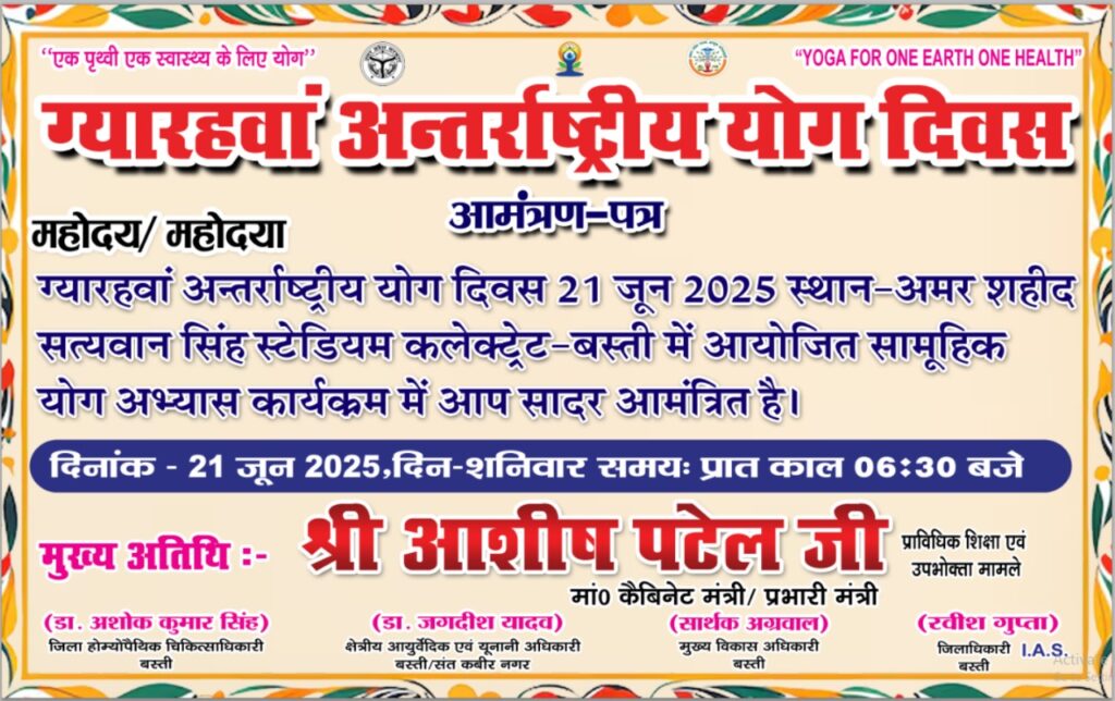 बस्ती (उ. प्र.)। जिलाधिकारी रवीश गुप्ता, मुख्य विकास अधिकारी सार्थक अग्रवाल, क्षेत्रीय आयुर्वेदिक एवं यूनानी अधिकारी डॉ. जगदीश यादव एवं जिला होम्योपैथी अधिकारी डॉ. अशोक कुमार सिंह ने ग्यारहवें अन्तर्राष्ट्रीय योग दिवस पर राजकीय इण्टर कॉलेज के मल्टीपरपज हाल में मर आयोजित सामूहिक योग अभ्यास कार्यक्रम में सभी को भी आमंत्रित किया है। यह कार्यक्रम पहले अमर शहीद सत्यवान सिंह स्टेडियम कलेक्ट्रेट बस्ती में किया जाना था, किन्तु बारिश के कारण कार्यक्रम स्थल में बदलाव करना पड़ा।