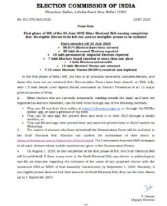 चुनाव आयोग ने इसके साथ यह भी बताया है कि इस पूरी प्रक्रिया के दौरान 7.17 करोड़ मतदाता फार्म, जो कुल का लगभग 90.89% हैं, उसे प्राप्त हुए हैं। इन फार्म का डिजिटलीकरण भी आयोग की ओर से किया गया है। बिहार में बीते 22 सालों में ये पहली बार है, जब इस तरह से मतदाता सूची का विशेष गहन पुनरीक्षण किया जा रहा है। इसका मुख्य उद्देश्य मतदाता सूची को दुरुस्त करना, साफ-सुथरा और पारदर्शी बनाना है। इसके माध्यम से अयोग्य, डुप्लिकेट/फर्जी या गैर-मौजूद प्रविष्टियों को हटाया जाना है, ताकि सुनिश्चित किया जा सके कि केवल सभी पात्र नागरिक ही इसमें शामिल हों।