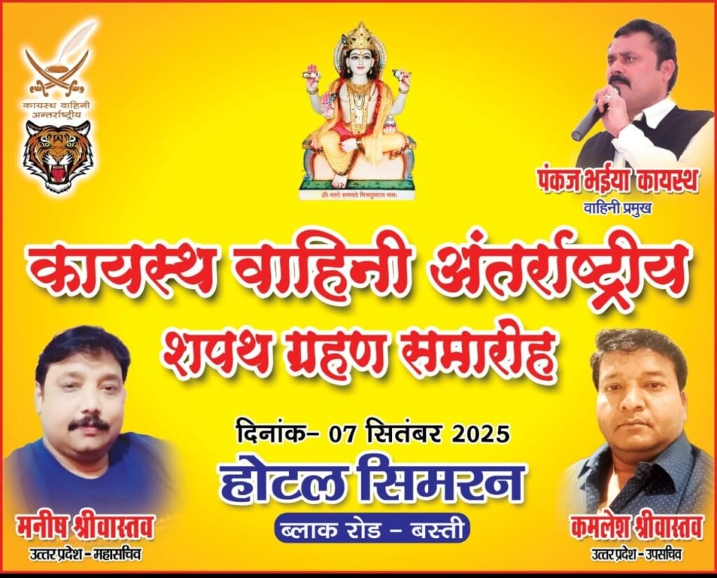 उन्होने कहा देश की आजादी के बाद से ही कायस्थ समाज गंभीर साजिश का शिकार है। यहां तक कि कायस्थों के आराध्य भगवान श्रीचित्रगुप्त को भी महत्वहीन किया गया। कायस्थ वाहिनी व्यापक स्तर पर संपर्क अभियान चलाकर कायस्थों को उनका सम्मान वापस दिलाने तथा भगवान चित्रगुप्त को सर्वसमाज में स्थापित करने का प्रयास कर रही है। वाहिनी अंतर्राष्ट्रीय के उत्तर प्रदेश उपसचिव कमलेश श्रीवास्तव ने बताया कि 7 सितम्बर को ब्लॉक रोड स्थित एक होटल के सभागार में दिन में 1.00 बजे जिला व प्रदेश स्तरीय पदाधिकारियों का शपथ ग्रहण समारोह आयोजित किया जा रहा है।