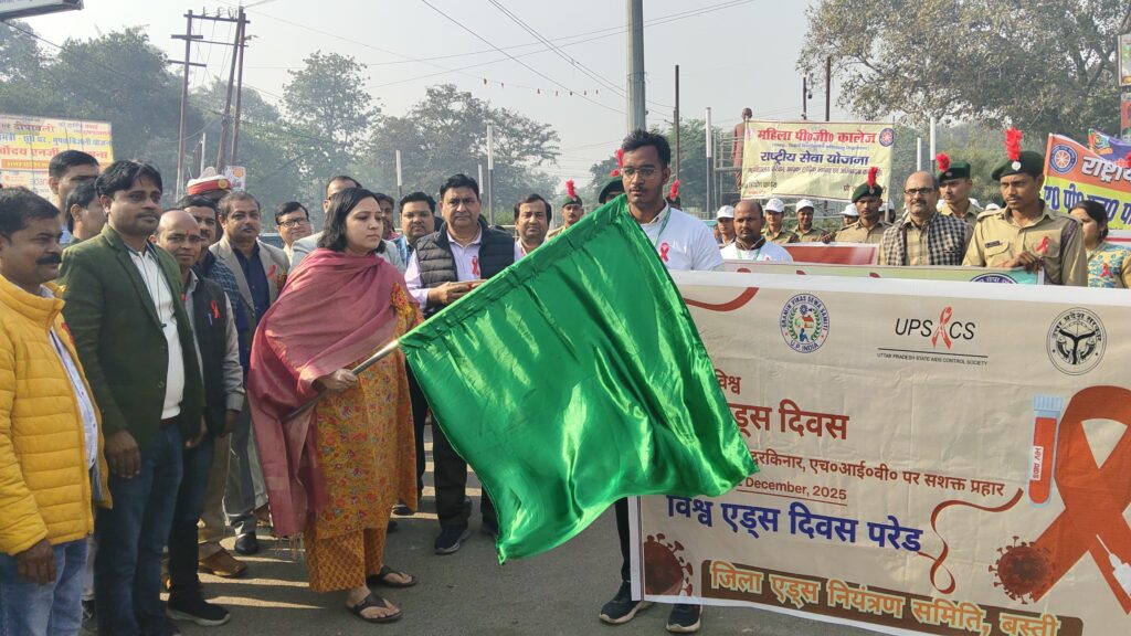 बस्ती (सू.वि.उ.प्र.)। विश्व एड्स दिवस के अवसर पर जिलाधिकारी श्रीमती कृत्तिका ज्योत्स्ना ने जिला एड्स नियंत्रण समिति द्वारा निकाली गयी जागरूकता रैली को शास्त्री चौक से हरी झण्डी दिखाकर रवाना किया। मुख्य चिकित्साधिकारी डा. राजीव निगम ने बताया कि (एच.आई.वी. दरकिनार) एड्स नियंत्रण हेतु यह जागरूकता कार्यक्रम संचालित किया जा रहा है। रैली में महिला पी.जी. कालेज की राष्ट्रीय सेवा योजना की टीम शामिल रहीं।