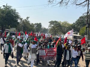 बस्ती (उ.प्र.)। ट्रेड यूनियन संगठनों और संयुक्त किसान मोर्चा ने जनपद में हड़ताल को सफल बताया है। सीटू सहित अन्य श्रमिक महासंघों के केंद्रीय फेडरेशन, खेत मजदूर यूनियन और संयुक्त किसान मोर्चा के श्रमिकों, किसानों की मांगों को लेकर देशव्यापी आम हड़ताल के क्रम में सीटू, एटक, एक्टू से जुड़े एमडीएम रसोइया कर्मचारी यूनियन, यूपीएमएसआरए, जिला ट्रेड यूनियन कौंसिल, आशा, ई रिक्शा संचालक यूनियन, बिजली कर्मचारी संघ, ट्रेड यूनियन कौंसिल, आशा कर्मचारी यूनियन, जल कल यूनियन, संविदा और खेत मजदूर यूनियन, भारतीय किसान यूनियन, किसान सभा तथा अन्य श्रमिक महासंघों से संबद्ध यूनियन, जनौस, एडवा, एआईएसएफ आदि जनवादी संगठनों ने ध्रुव चंद, अशर्फी लाल गुप्ता, रंजीत श्रीवास्तव, राम अचल निषाद, गौरी शंकर चौधरी, शिवाजी शुक्ला सोनी, सत्यभान, शिव चरण निषाद, परशुराम, वसीम के संयुक्त नेतृत्व में न्याय मार्ग स्थित सीटू कार्यालय पर इकट्ठा हो कर जुलूस के रूप में न्याय मार्ग, कचहरी, शास्त्री चौक से होते हुए जिलाधिकारी कार्यालय पहुंच कर जबरदस्त प्रदर्शन किया। प्रदर्शन के दौरान चारों श्रम संहिता और भारत अमेरिका समझौते की प्रतियां जलाई गईं और उप जिलाधिकारी बस्ती सदर शत्रुघ्न पाठक के माध्यम से महामहिम राष्ट्रपति को संबोधित 08 सूत्रीय मांगपत्र सौंपा।