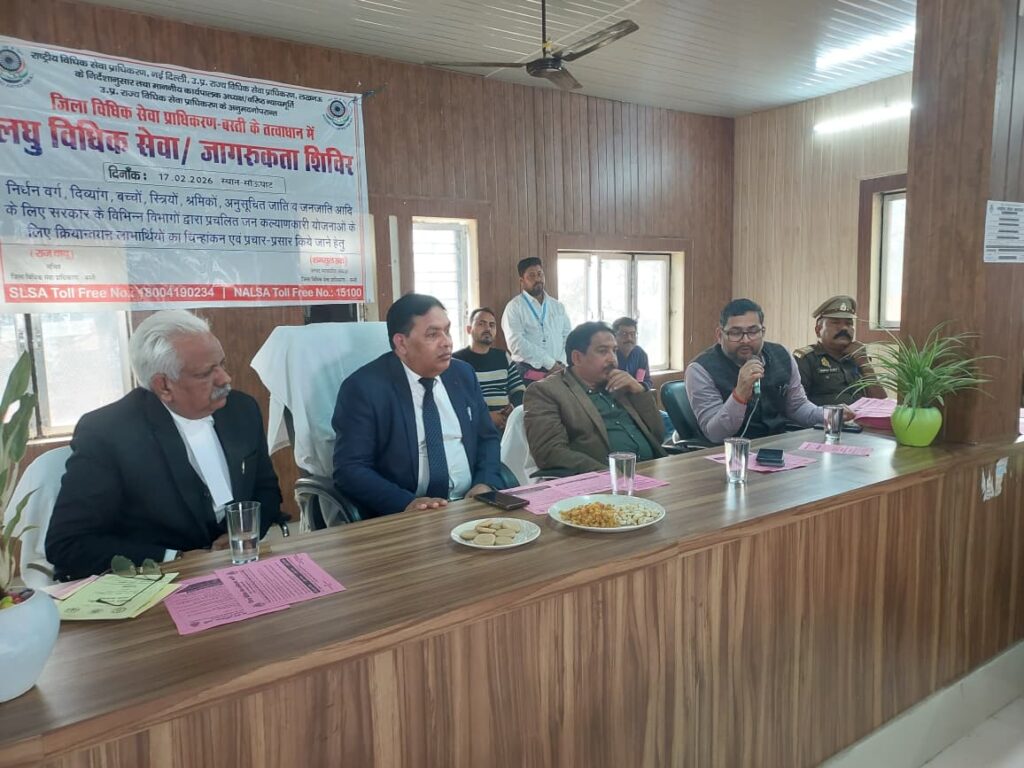 बस्ती (उ.प्र.)। राष्ट्रीय विधिक सेवा प्राधिकरण, नई दिल्ली एवं उ.प्र.राज्य विधिक सेवा प्राधिकरण, लखनऊ के निर्देशानुसार एवं माननीय जनपद न्यायाधीश/अध्यक्ष, जिला विधिक सेवा प्राधिक रण, बस्ती श्री शमसुल हक के मार्गदर्शन में दिनांक 17/02/2026 को ब्लाक साउँघाट पर लघु शिविर(प्री-कैम्प) का आयोजन किया गया। सचिव, जिला विधिक सेवा प्राधिकरण, बस्ती श्री राज बाबू रहे द्वारा उक्त लघु शिविर(प्री-कैम्प) के माध्यम से जानकारी दी गयी कि दिनांक 22-02-2026 को अटल बिहारी वाजपेयी प्रेक्षागृह(बस्ती क्लब) में मेगा/वृहद शिविर का आयोजन किया गया है जिसमें जिले के समस्त सरकारी विभागों के समन्वय से निर्बल वर्ग, दिव्यांगजन, बच्चों, स्त्रियों, निर्धन वर्ग, असंगठित क्षेत्र के श्रमिक तथा अनुसूचित जाति एवं अनुसूचित जनजाति हेतु जनकल्याणकारी योजनाओं का प्रदर्शन एवं प्रचार-प्रसार होगा एवं विभिन्न प्रकार की जन लाभकारी सरकारी योजनाओँ से पात्र व्यक्तियों को लाभान्वित किया जायेगा।