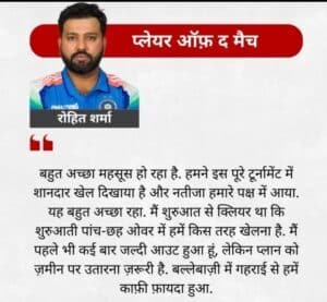भारतीय पारी की दूसरी गेंद पर ही कप्तान रोहित शर्मा ने छक्का लगाकर बड़ी पारी खेलने के इरादे जाहिर कर दिए थे। रोहित शर्मा ने इतनी कमाल की बल्लेबाजी की कि पहले पावरप्ले के बाद भारत का स्कोर बिना किसी नुकसान के 64 रन था। इन 64 रनों में रोहित शर्मा ने 49 रन का योगदान दिया था, जबकि गिल के बल्ले से महज 10 रन ही आए थे। पहले पावरप्ले के तुरंत बाद रोहित शर्मा ने 41 गेंद पर अपना अर्धशतक पूरा किया। रोहित शर्मा को कमाल के फॉर्म में देखकर शुभमन गिल ने भी हाथ खोलना शुरू किया और 17 ओवर में ही भारत का स्कोर बिना किसी नुकसान के 100 रन हो गया था।