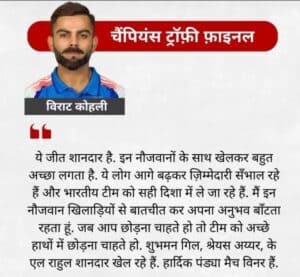 इससे पहले 2002 में भारत श्रीलंका के साथ चैंपियंस ट्रॉफी का संयुक्त विजेता बना था। वहीं 2013 में धोनी की अगुवाई में टीम इंडिया चैंपियन बनने में कामयाब रही थी। रोहित शर्मा को 76 रन की पारी खेलने के लिए प्लेयर ऑफ द मैच चुना गया। रोहित शर्मा की 76 रन की पारी के अलावा भारत को विजेता बनाने में कुलदीप यादव और वरुण चक्रवर्ती की गेंदबाजी का भी अहम योगदान दिया। कुलदीप यादव और वरुण चक्रवर्ती ने दो – दो विकेट हासिल किए। इस जीत के साथ भारत ने न्यूजीलैंड के खिलाफ 25 साल पहले चैंपियंस ट्रॉफी के फाइनल में मिली हार का हिसाब भी चुकता कर लिया। वर्ष 2000 में न्यूजीलैंड भारत को चार विकेट से मात देकर चैंपियन बना था।