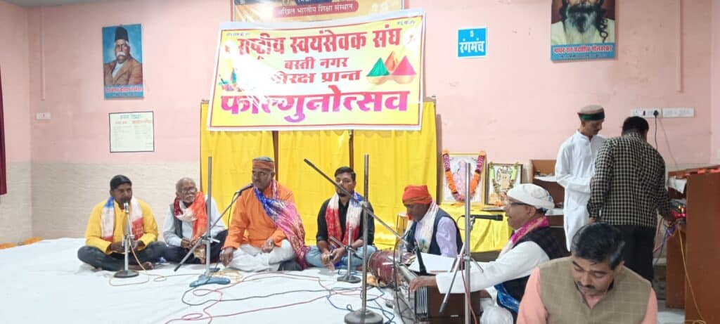 बस्ती (उ. प्र.)। जिले के रामबाग में राष्ट्रीय स्वयंसेवक संघ द्वारा फाल्गुनोत्सव का आयोजन किया गया। कार्यक्रम में कलाकारों ने फगुआ प्रस्तुत किया। ढोल-मजीरे की धुन और तालियों की गड़गड़ाहट से माहौल सराबोर हो गया।