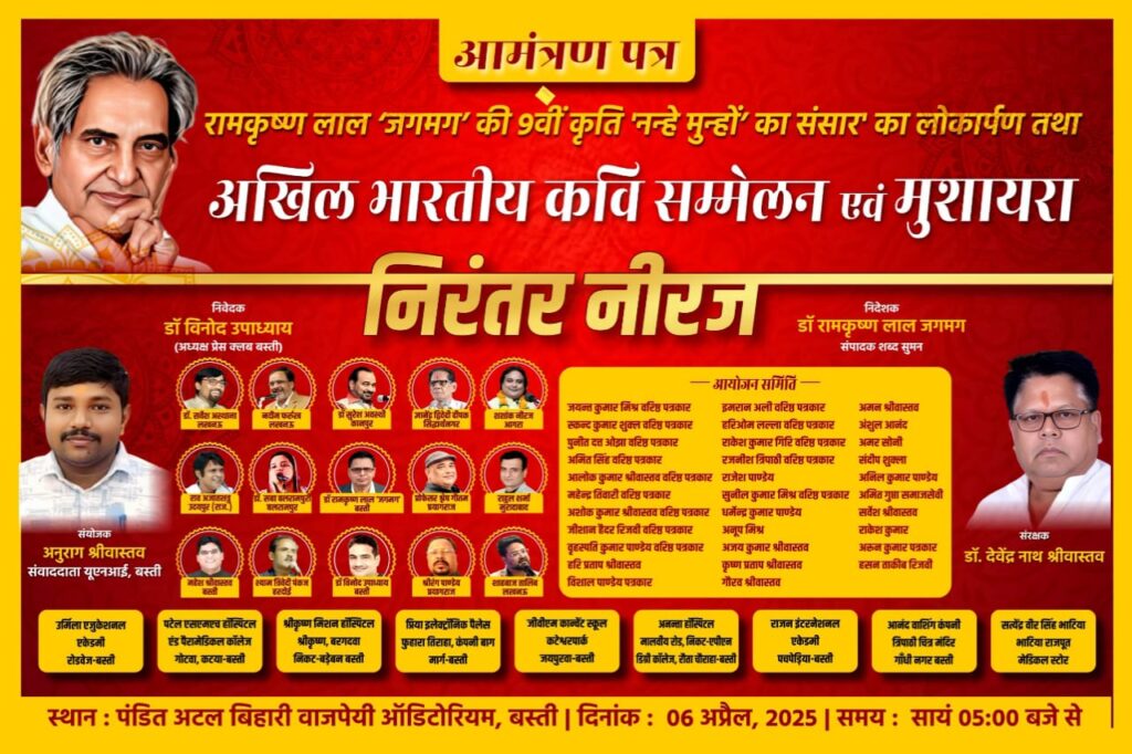 बस्ती (उ. प्र.)। जिला मुख्यालय पर स्थित पंडित अटल बिहारी बाजपेई ऑडिटोरियम में 06 अप्रैल 2025 को कवि सम्मेलन एवं मुशायरा का आयोजन सांय 05ः00 बजे से